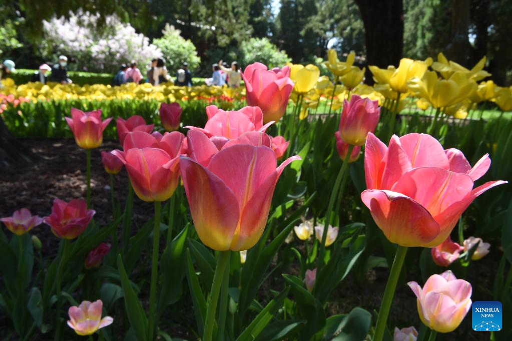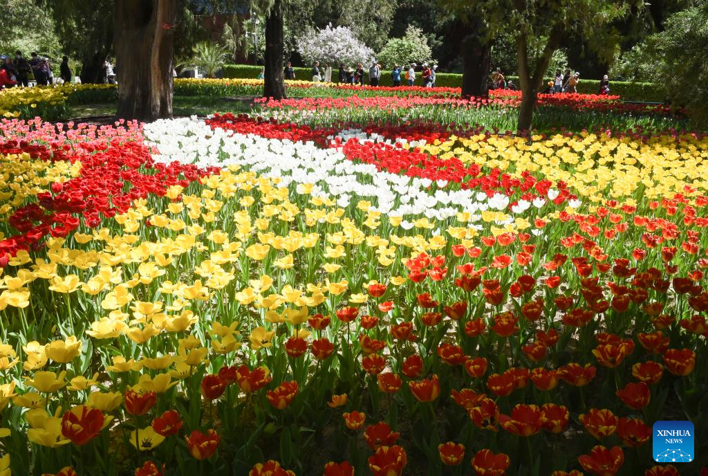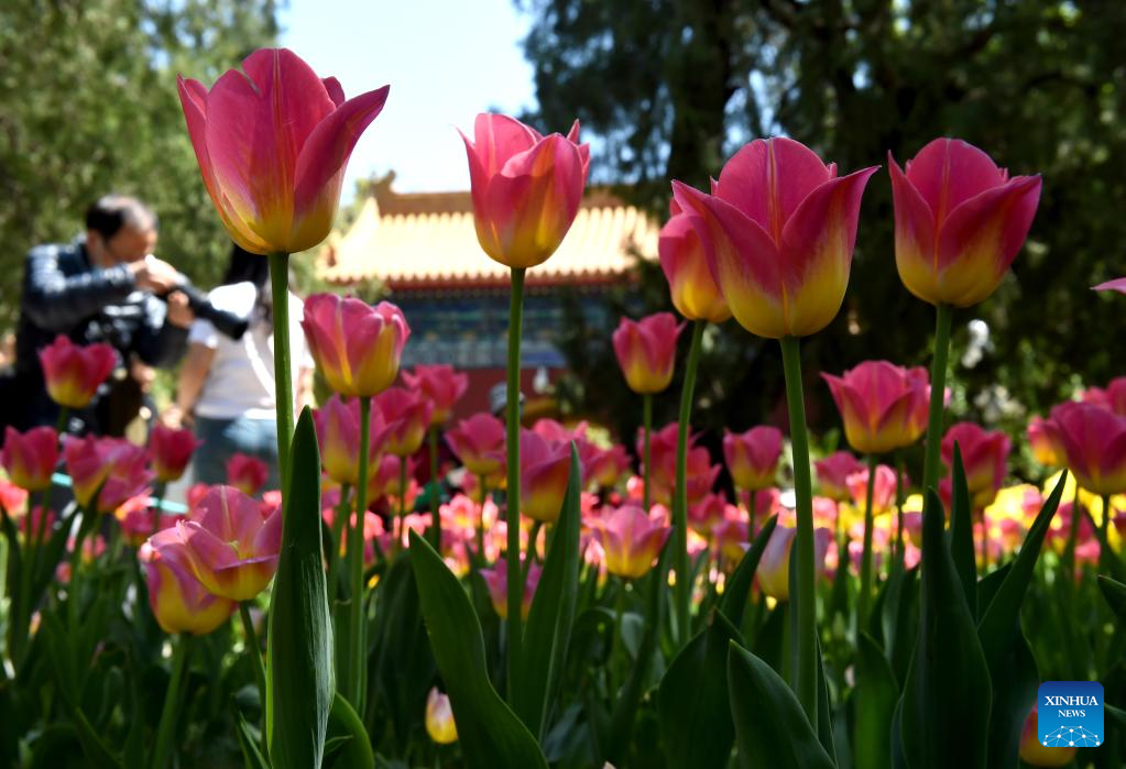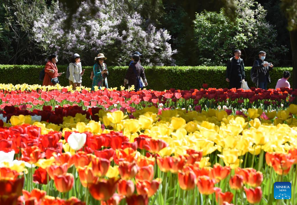 Tourists enjoy blooming tulips at Zhongshan Park in Beijing, capital of China, April 18, 2023. Tulips are now in full blossom at Zhongshan Park. This year, the park has set up six theme areas to showcase nearly 200,000 bulb flowers in 85 varieties. (Xinhua/Luo Xiaoguang)