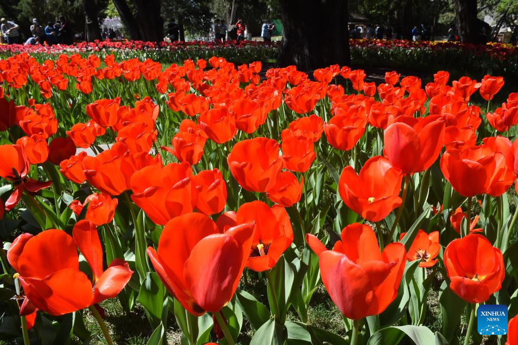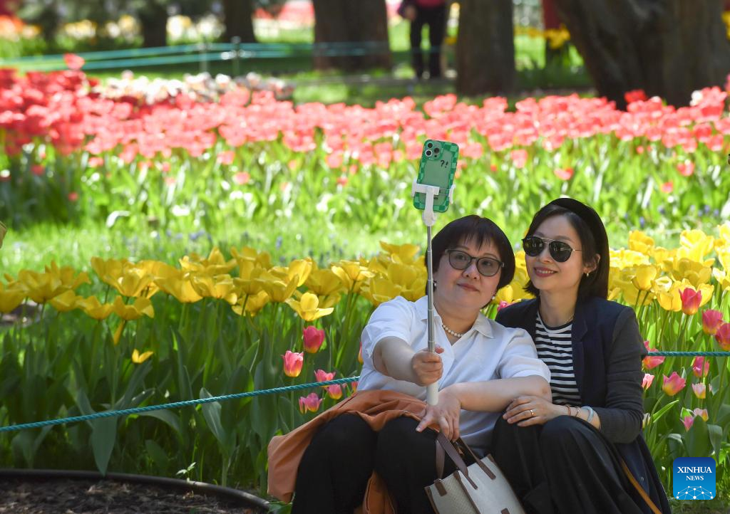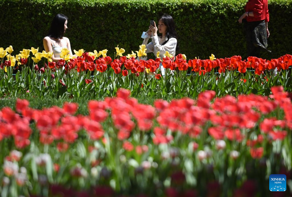 Tourists take photos amid blooming tulips at Zhongshan Park in Beijing, capital of China, April 18, 2023. Tulips are now in full blossom at Zhongshan Park. This year, the park has set up six theme areas to showcase nearly 200,000 bulb flowers in 85 varieties. (Xinhua/Luo Xiaoguang)