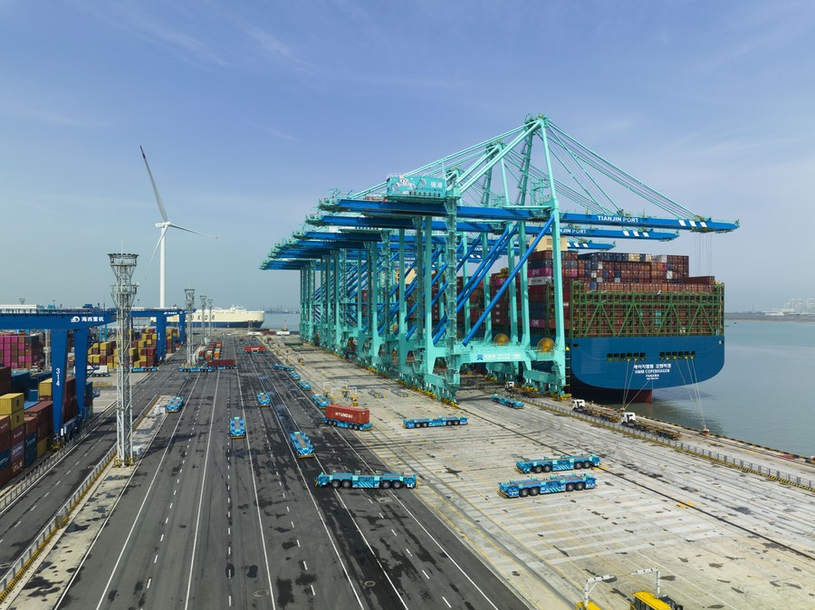 This aerial photo taken on April 6, 2023 shows a container ship at the smart zero-carbon terminal of Tianjin Port in north China's Tianjin Municipality. Tianjin Port handled approximately 5.047 million twenty-foot equivalent units (TEUs) of containers in the first three months of 2023, up 9.09 percent year on year. (Photo by Han Xilong/Xinhua)