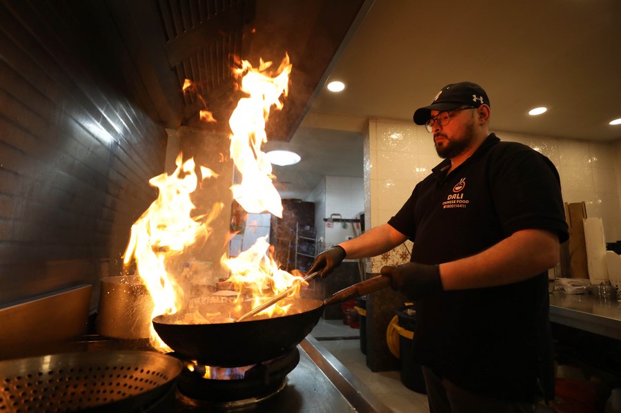 Palestinian chef Amir al-Dali prepares Chinese dishes at a restaurant in the West Bank city of Ramallah, on April 9, 2023. (Photo by Ayman Nobani/Xinhua)