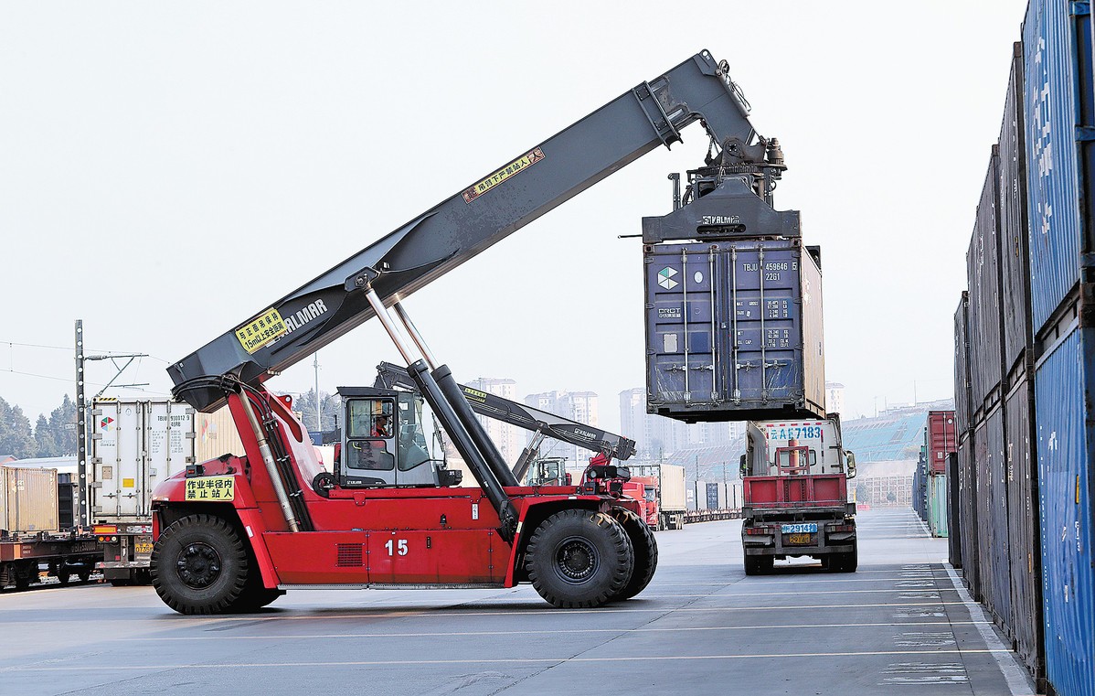 A worker at the freight yard in Kunming, capital of Yunnan province, loads a container onto a train bound for Vientiane, capital of Laos, on April 5. YANG ZHENG/FOR CHINA DAILY