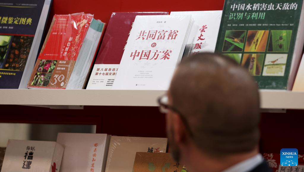 A man visits a booth displaying China-themed books at the London Book Fair in London, Britain, April 18, 2023. (Xinhua/Li Ying)