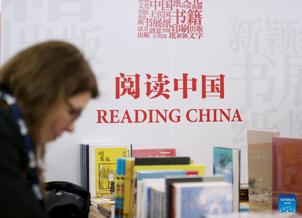 People visit a booth displaying China-themed books at the London Book Fair in London, Britain, April 18, 2023. (Xinhua/Li Ying)