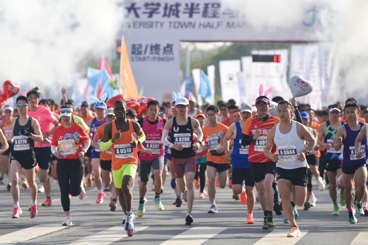 The 2023 Nanjing Jiangning University Town Half Marathon starts at the Jiangning University Town Sports Center, with over ten thousand marathon enthusiasts running amid the mountains and rivers, experiencing the fun of running, April 9, 2023. (People's Daily Online/Fang Dongxu)