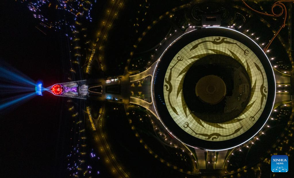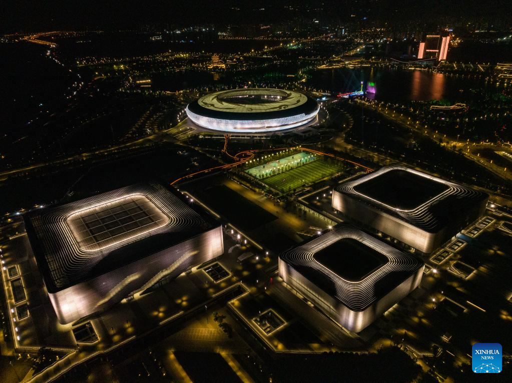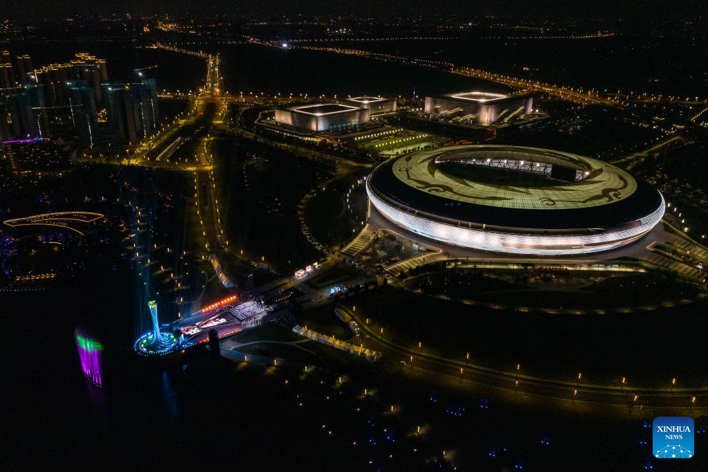 Aerial photo taken on April 19, 2023 shows the stadium for the opening ceremony and cauldron in the light show for 100-day countdown to the Chengdu 2021 FISU World University Games at Dong'an Lake Sports Park in Chengdu, southwest China's Sichuan Province. (Xinhua/Shen Bohan)