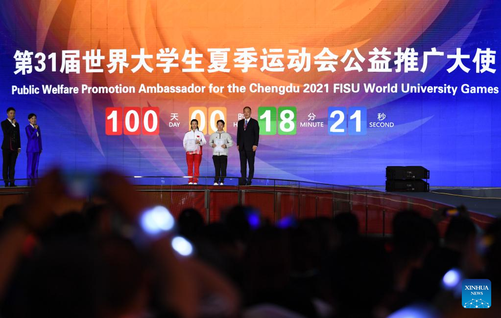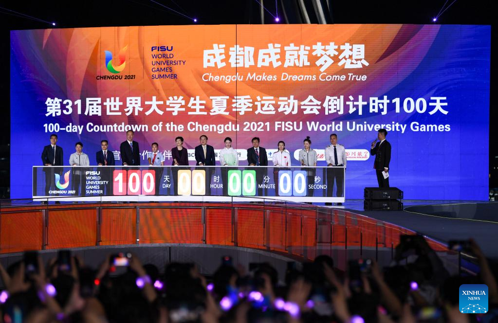 Guests start the countdown on the 100-day countdown event for the Chengdu 2021 FISU World University Games at Dong'an Lake Sports Park in Chengdu, southwest China's Sichuan Province, April 19, 2023. (Xinhua/Wang Xi)