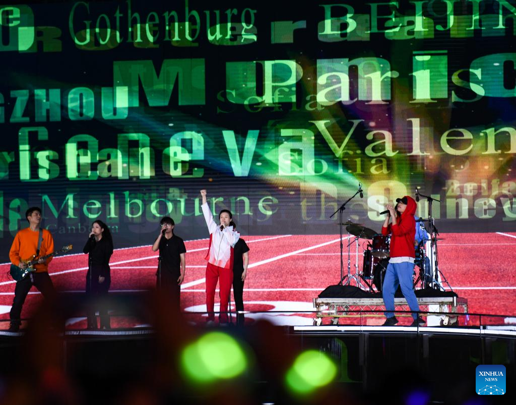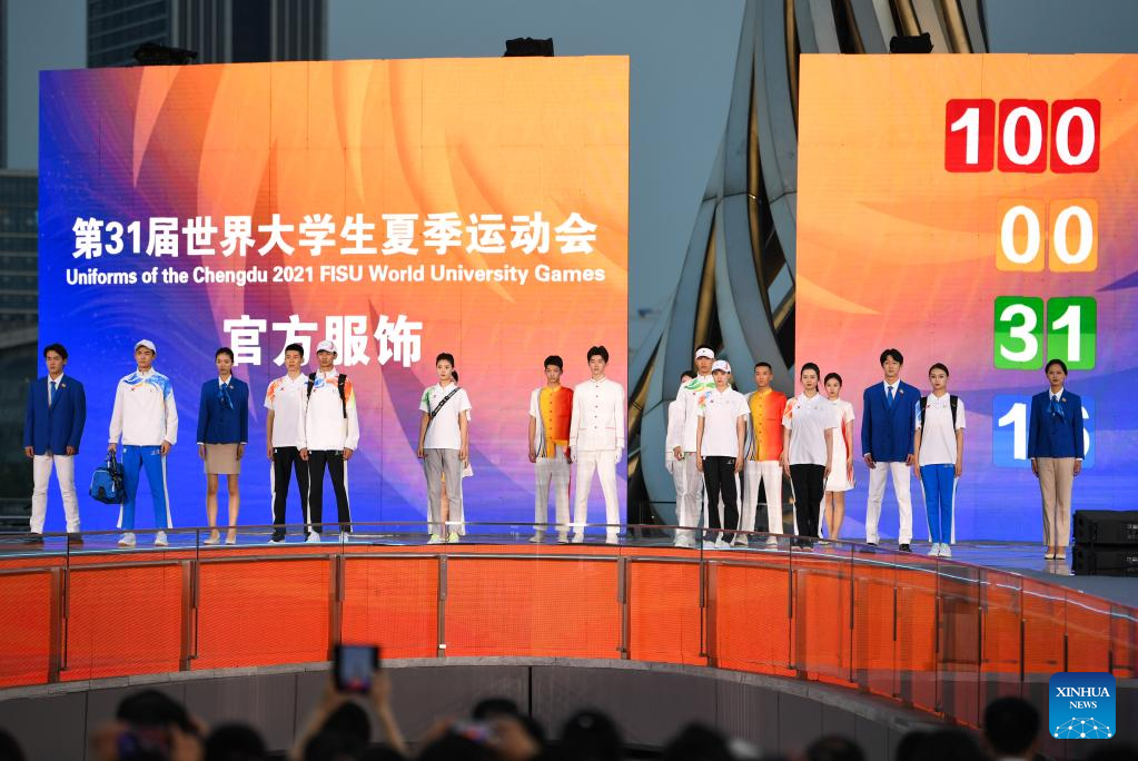 Models present the uniforms of the Chengdu 2021 FISU World University Games on the 100-day countdown event at Dong'an Lake Sports Park in Chengdu, southwest China's Sichuan Province, April 19, 2023. (Xinhua/Wang Xi)