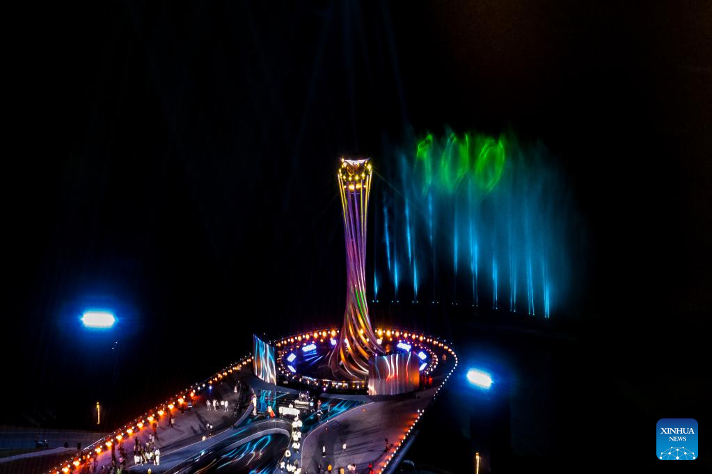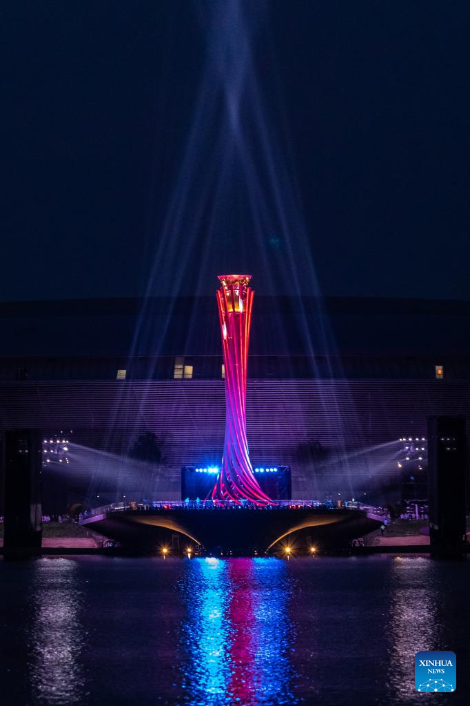 Photo taken on April 19, 2023 shows the stadium for the opening ceremony and cauldron in the light show for 100-day countdown to the Chengdu 2021 FISU World University Games at Dong'an Lake Sports Park in Chengdu, southwest China's Sichuan Province. (Xinhua/Shen Bohan)