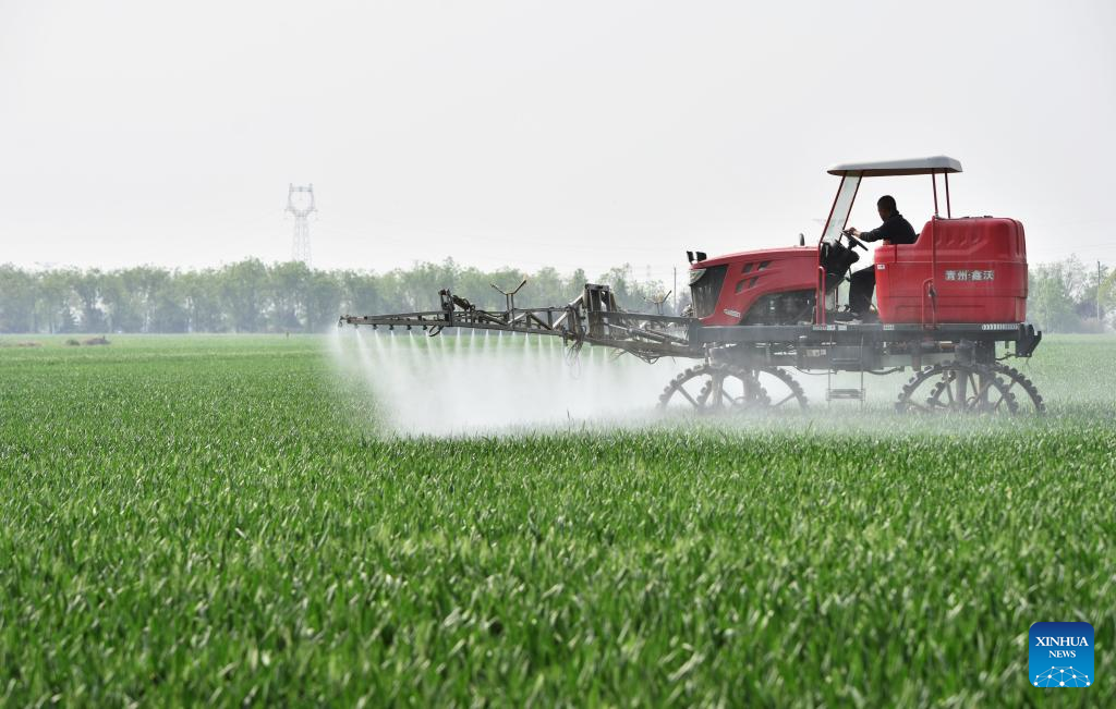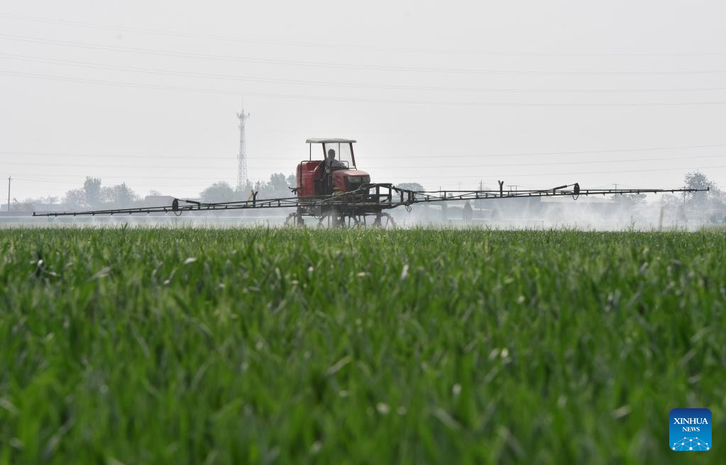 A farmer sprays pesticide in a wheat field with agricultural machinery in Zhangxiang Village, Heguo Township of Nanhe District in Xingtai City, north China's Hebei Province, April 19, 2023. As the winter wheat enters the heading stage in central and southern Hebei Province, local agricultural departments have been guiding farmers to carry out wheatland management on time to secure a bumper summer harvest. (Xinhua/Zhu Xudong)