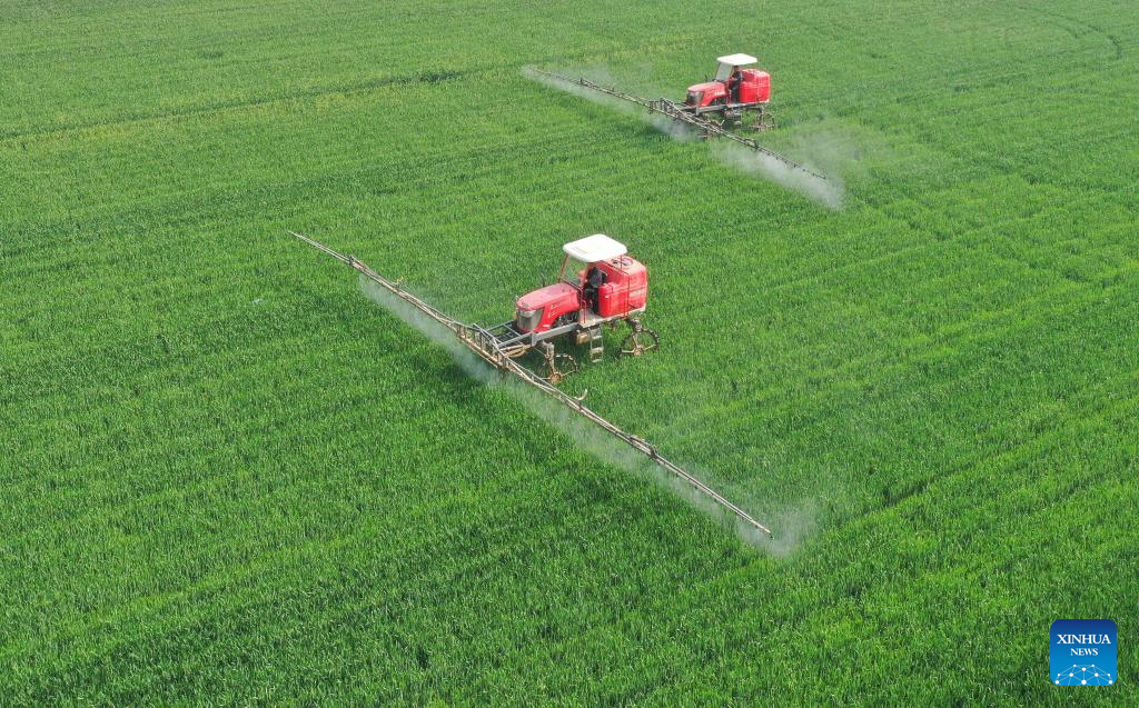 This aerial photo shows farmers spraying pesticide in a wheat field with agricultural machinery in Zhangxiang Village, Heguo Township of Nanhe District in Xingtai City, north China's Hebei Province, April 19, 2023. As the winter wheat enters the heading stage in central and southern Hebei Province, local agricultural departments have been guiding farmers to carry out wheatland management on time to secure a bumper summer harvest. (Xinhua/Zhu Xudong)