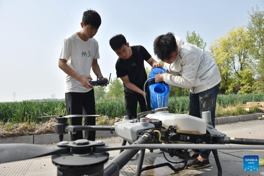 Farmers add pesticide into a plant-protection drone in Zhangxiang Village, Heguo Township of Nanhe District in Xingtai City, north China's Hebei Province, April 19, 2023. As the winter wheat enters the heading stage in central and southern Hebei Province, local agricultural departments have been guiding farmers to carry out wheatland management on time to secure a bumper summer harvest. (Xinhua/Zhu Xudong)