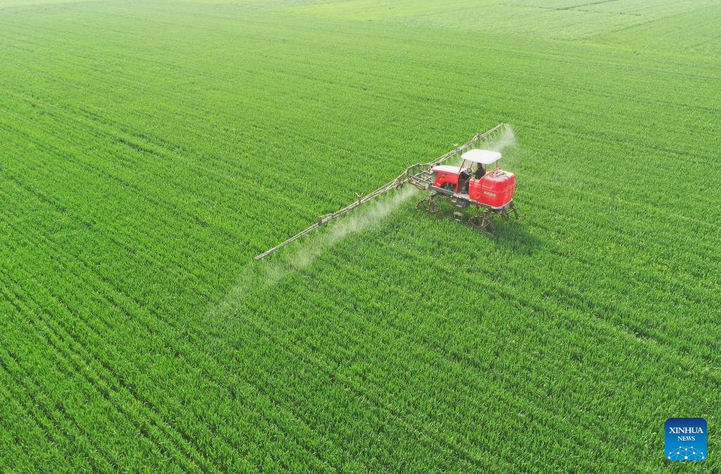 This aerial photo shows a farmer spraying pesticide in a wheat field with agricultural machinery in Zhangxiang Village, Heguo Township of Nanhe District in Xingtai City, north China's Hebei Province, April 19, 2023. As the winter wheat enters the heading stage in central and southern Hebei Province, local agricultural departments have been guiding farmers to carry out wheatland management on time to secure a bumper summer harvest. (Xinhua/Zhu Xudong)