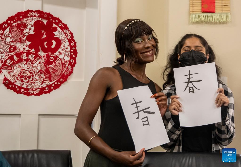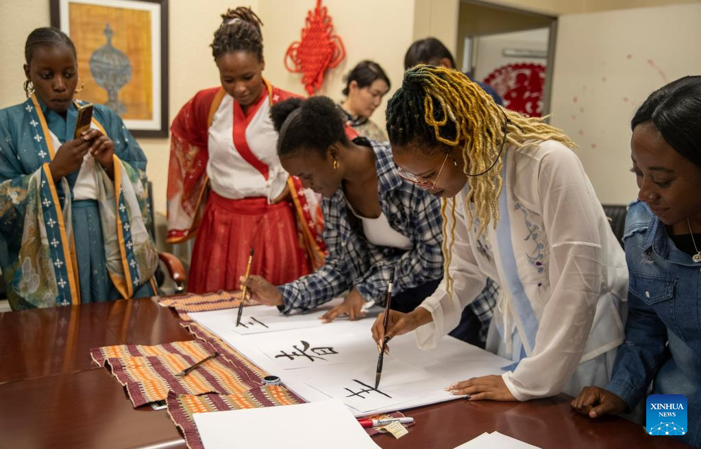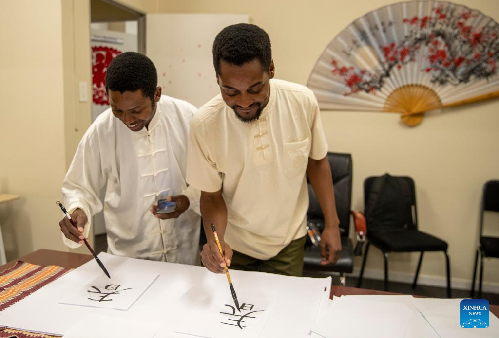 Students write Chinese calligraphy during an event celebrating the upcoming UN Chinese Language Day at the Confucius Institute at the University of Johannesburg in Johannesburg, South Africa, on April 19, 2023. (Xinhua/Zhang Yudong)