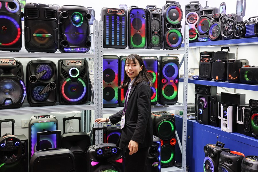 An exhibitor arranges audio products at the Consumer Electronics and Information Products exhibition section of the 133rd session of China Import and Export Fair, also known as Canton Fair, in Guangzhou, south China's Guangdong Province, April 15, 2023. (Xinhua/Liu Dawei)