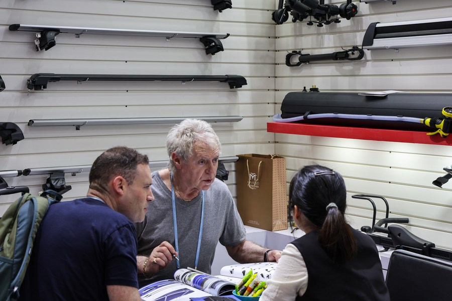 British buyers negotiate business at the Vehicles &Spare Parts exhibition section of the 133rd session of China Import and Export Fair, also known as Canton Fair, in Guangzhou, south China's Guangdong Province, April 15, 2023. (Xinhua/Liu Dawei)