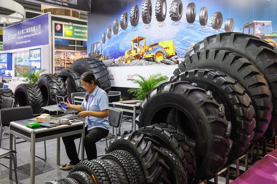 Tyres are exhibited at the Vehicles &Spare Parts exhibition section of the 133rd session of China Import and Export Fair, also known as Canton Fair, in Guangzhou, south China's Guangdong Province, April 15, 2023. (Xinhua/Liu Dawei)