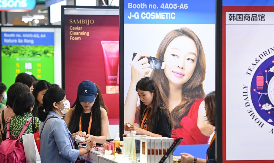 This photo taken on April 12, 2023 shows booths of South Korean enterprises at the third China International Consumer Products Expo (CICPE) in Haikou, south China's Hainan Province. (Xinhua/Yang Guanyu)