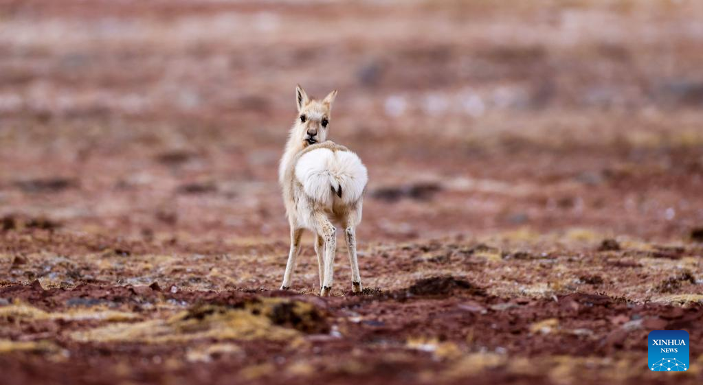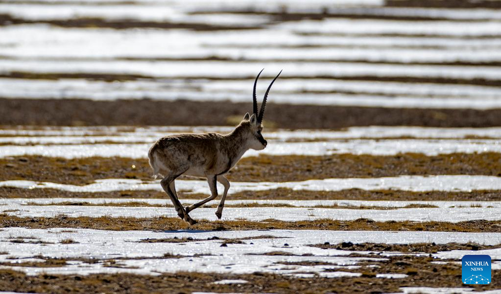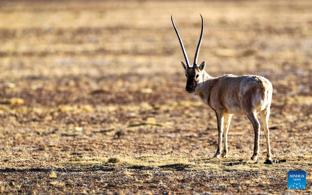 This photo taken on April 15, 2023 shows a Tibetan antelope at the Qiangtang National Nature Reserve in the northern part of southwest China's Tibet Autonomous Region.?(Xinhua/Jiang Fan)