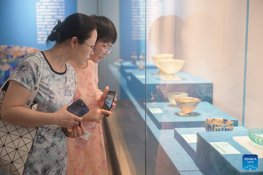 Visitors watch an exhibition titled "Lustrous Translucent Glass -- Ancient Glass Art along the Silk Road" at Hainan Museum in Haikou, capital city of south China's Hainan Province, on April 20, 2023. The exhibition introduces the ancient glassware collected by Japan's Hirayama Ikuo Silk Road Museum and displays 325 exquisite glassware that once spread to countries along the Silk Road, demonstrating the wisdom and creativity of all ethnic groups along the Silk Road. (Xinhua/Pu Xiaoxu)