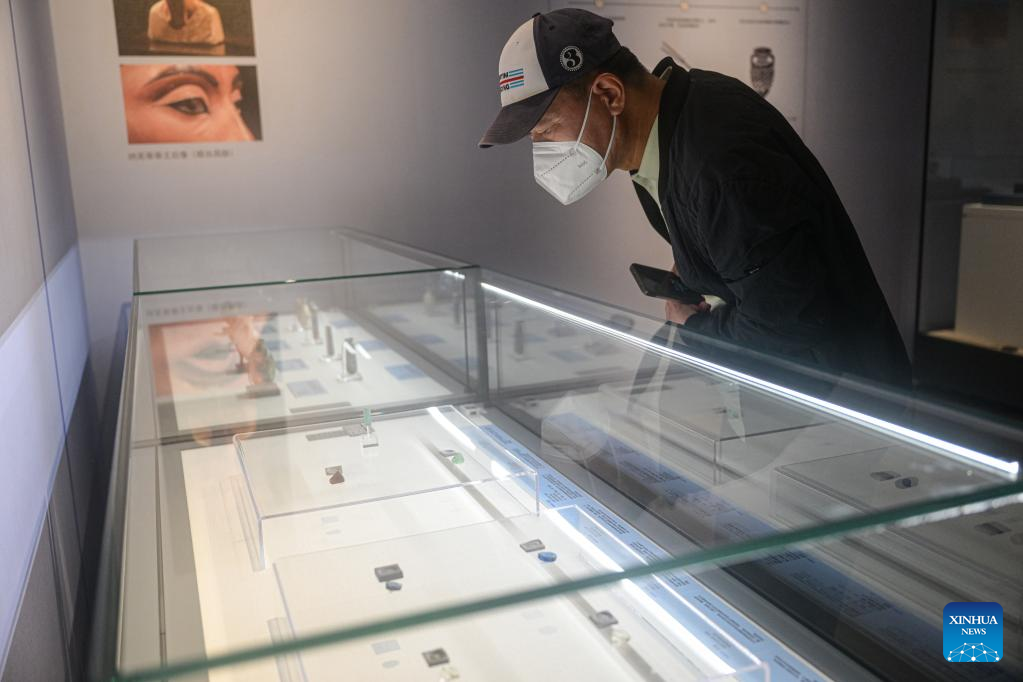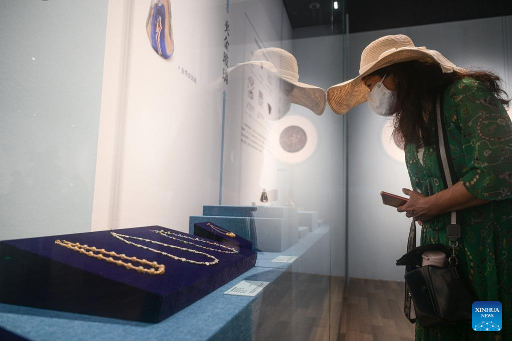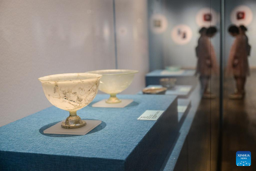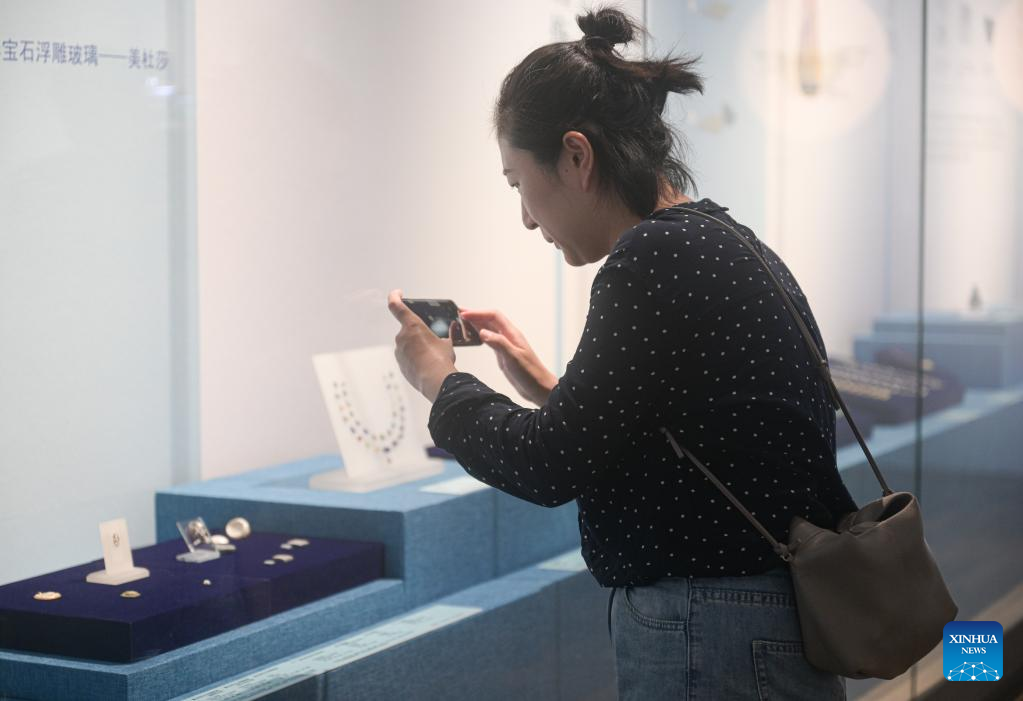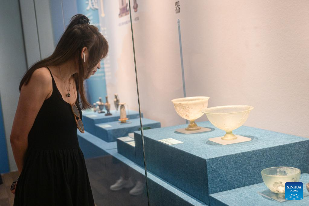 A visitor watches an exhibition titled "Lustrous Translucent Glass -- Ancient Glass Art along the Silk Road" at Hainan Museum in Haikou, capital city of south China's Hainan Province, on April 20, 2023. The exhibition introduces the ancient glassware collected by Japan's Hirayama Ikuo Silk Road Museum and displays 325 exquisite glassware that once spread to countries along the Silk Road, demonstrating the wisdom and creativity of all ethnic groups along the Silk Road. (Xinhua/Pu Xiaoxu)