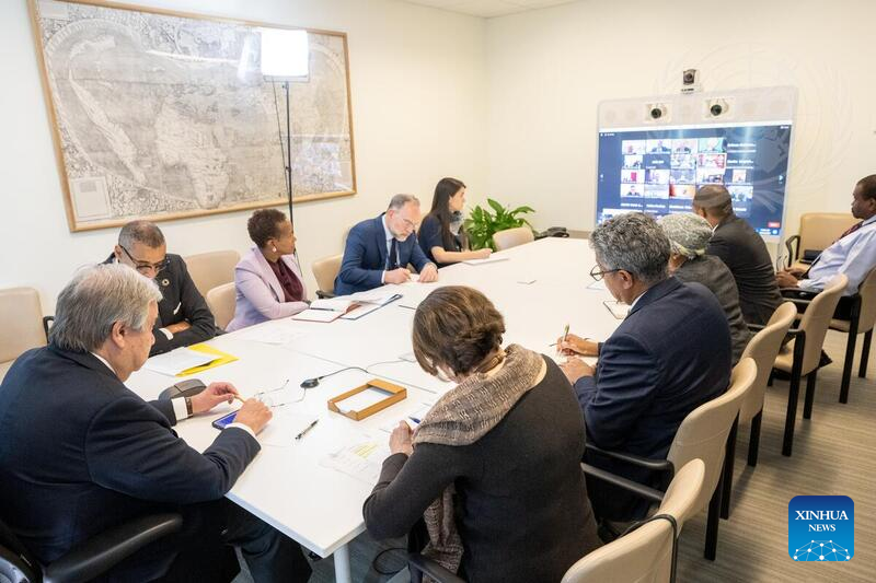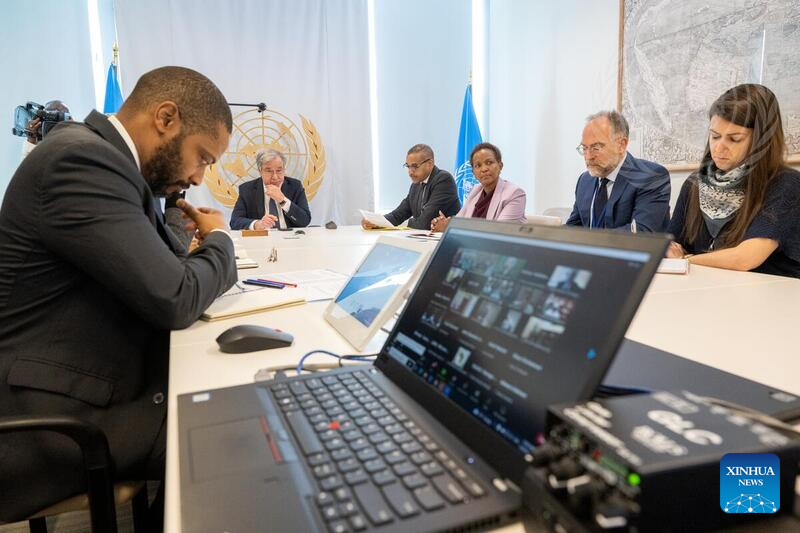 UN Secretary-General Antonio Guterres (L) virtually attend a meeting convened by the African Union on the Sudan crisis at UN headquarters in New York, on April 20, 2023. Guterres on Thursday called for a three-day ceasefire in Sudan to allow trapped civilians to flee. (Eskinder Debebe/UN Photo/Handout via Xinhua)