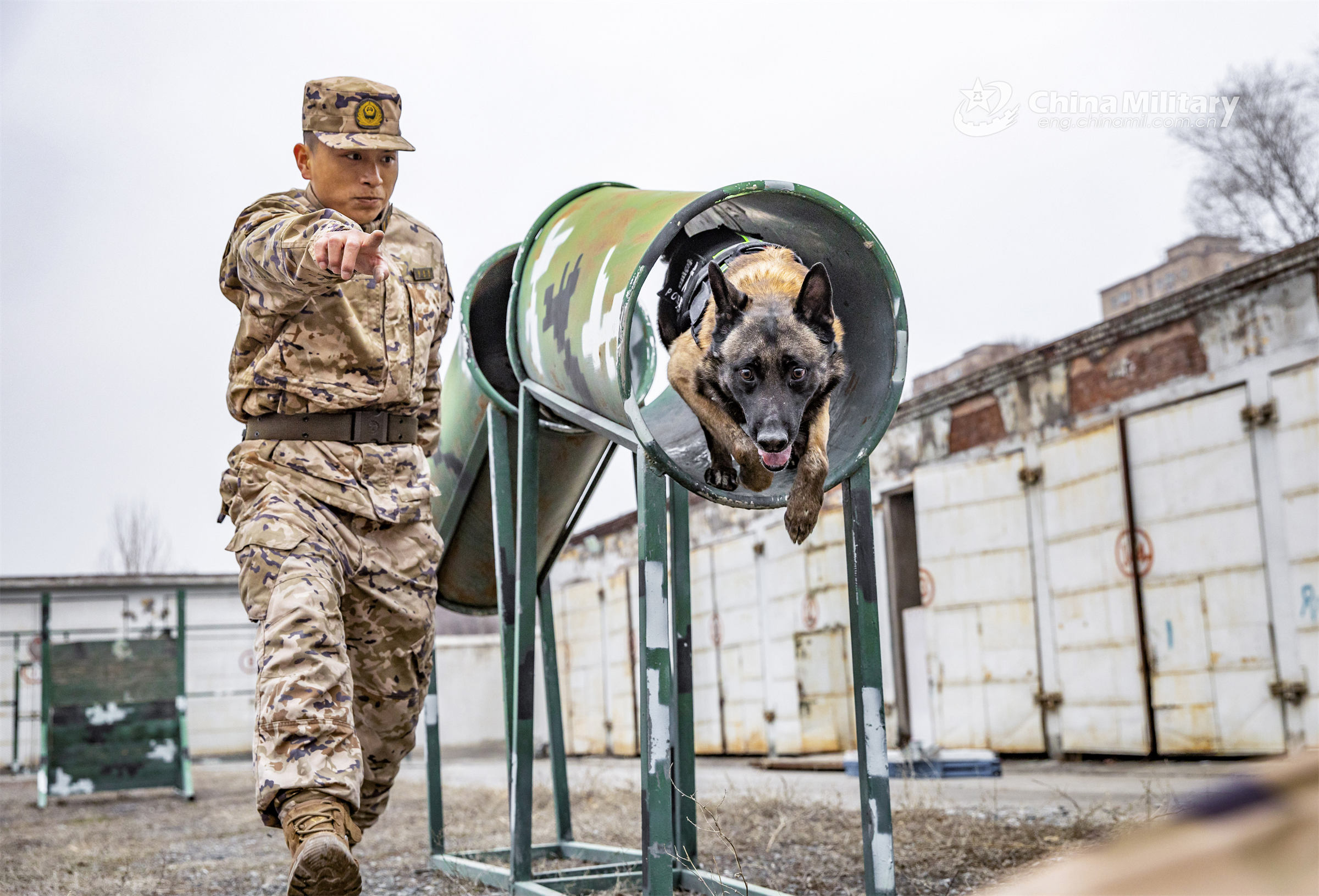 A soldier assigned to a detachment under the PAP Xinjiang Corps directs a military working dog to jump through barriers during comprehensive training on March 15, 2023. (eng.chinamil.com.cn/Photo by Yu Bo)