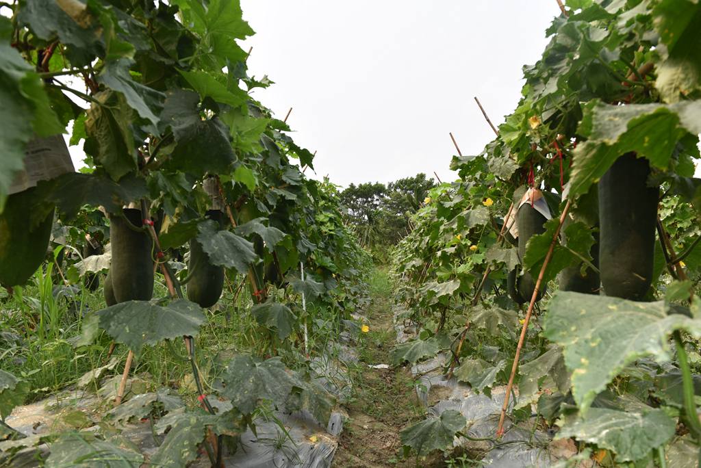 Photo shows flourishing wax gourds at a vegetable production base in Shantang village, Tunchang county, south China's Hainan Province. (Photo/Lin Xiaodan)