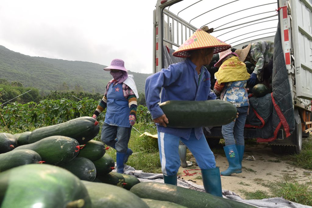 Photo shows workers loading wax gourds on a truck at a vegetable production base in Shantang village, Tunchang county, south China's Hainan Province. (Photo/Lin Xiaodan)