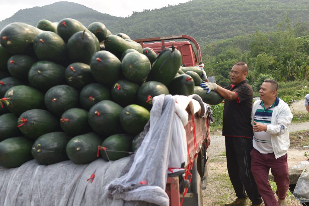 Photo shows workers loading wax gourds on a truck at a vegetable production base in Shantang village, Tunchang county, south China's Hainan Province. (Photo/Lin Xiaodan)