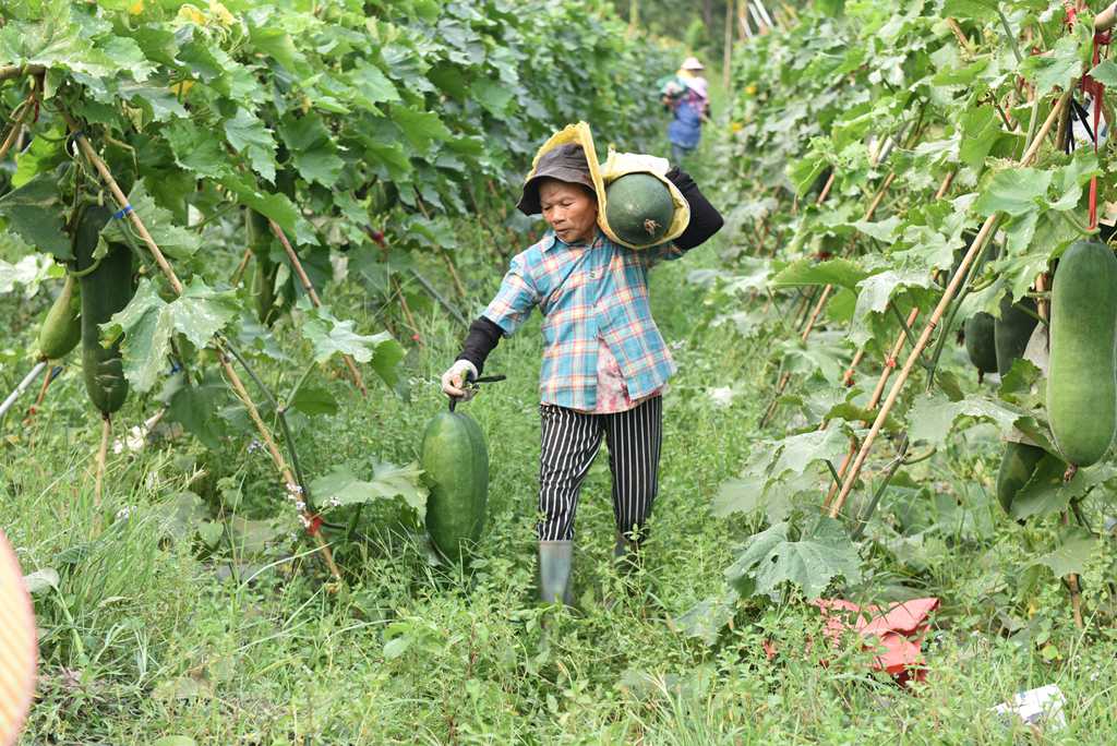 Inside a local vegetable production base, workers were busy picking and transferring large wax gourds, and loading them on trucks.