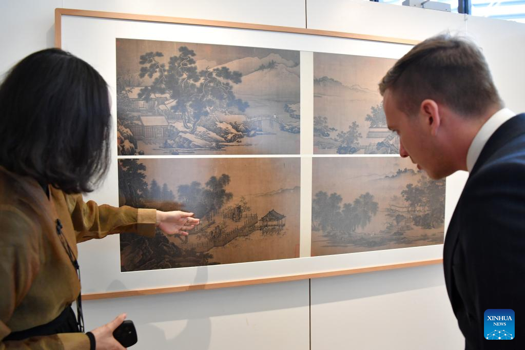 Participants visit an exhibition to mark UN Chinese Language Day in Geneva, Switzerland, on April 20, 2023. The United Nations (UN) Office at Geneva hosted an exhibition of paintings of the Song Dynasty (960-1279), part of the Great Collection of Chinese Paintings, on Thursday to mark the annually observed UN Chinese Language Day. (Xinhua/Lian Yi)