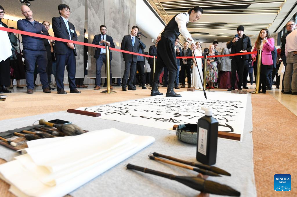 An artist performs Chinese calligraphy writing at an exhibition to mark UN Chinese Language Day in Geneva, Switzerland, on April 20, 2023. The United Nations (UN) Office at Geneva hosted an exhibition of paintings of the Song Dynasty (960-1279), part of the Great Collection of Chinese Paintings, on Thursday to mark the annually observed UN Chinese Language Day. (Xinhua/Lian Yi)