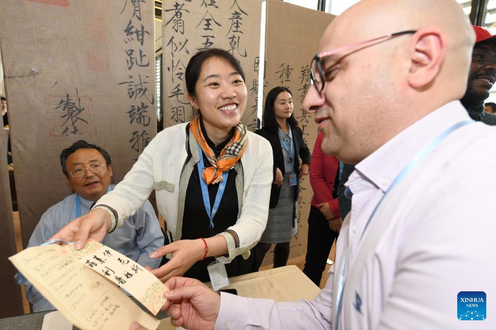 A participant receives a bookmark with his name written in Chinese calligraphy on it at an exhibition to mark UN Chinese Language Day in Geneva, Switzerland, on April 20, 2023. The United Nations (UN) Office at Geneva hosted an exhibition of paintings of the Song Dynasty (960-1279), part of the Great Collection of Chinese Paintings, on Thursday to mark the annually observed UN Chinese Language Day. (Xinhua/Lian Yi)