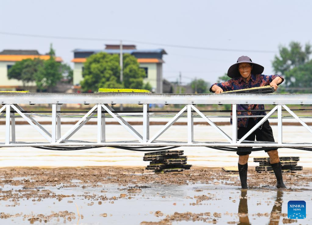 A farmer transports a rice seedling tray from a conveyer belt at an intelligent rice farming demonstration base in Gongyi Town of Pengshan District in Meishan, southwest China's Sichuan Province, April 20, 2023. Pengshan District has taken efforts to speed up the construction of digital intelligent rice farming demonstration base. Intelligent machinery has been used in the process of raising and transplanting to improve the efficiency of rice farming. (Xinhua/Wang Xi)