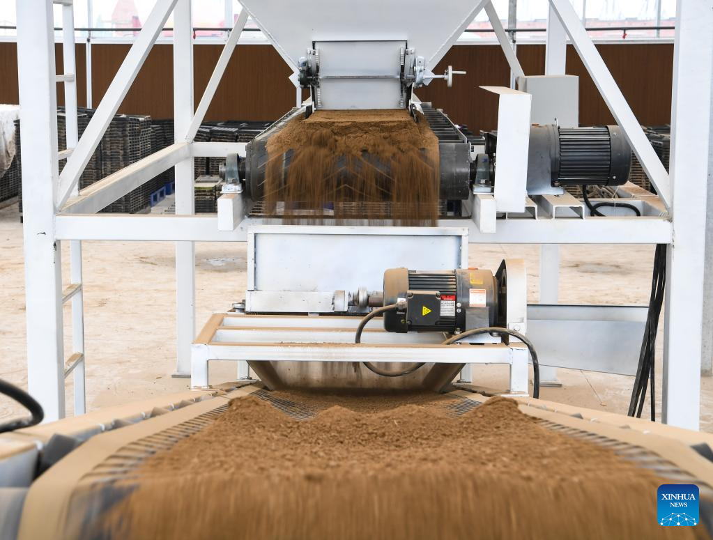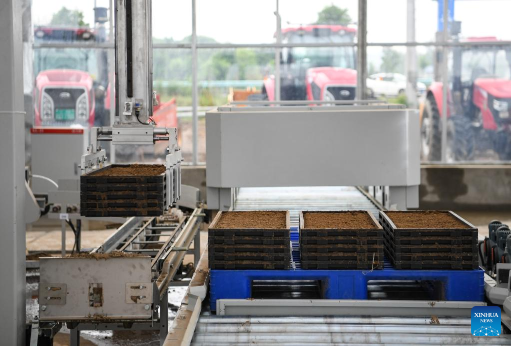 Soil is transported on an assembly line at an intelligent rice farming demonstration base in Gongyi Town of Pengshan District in Meishan, southwest China's Sichuan Province, April 20, 2023. Pengshan District has taken efforts to speed up the construction of digital intelligent rice farming demonstration base. Intelligent machinery has been used in the process of raising and transplanting to improve the efficiency of rice farming. (Xinhua/Wang Xi)