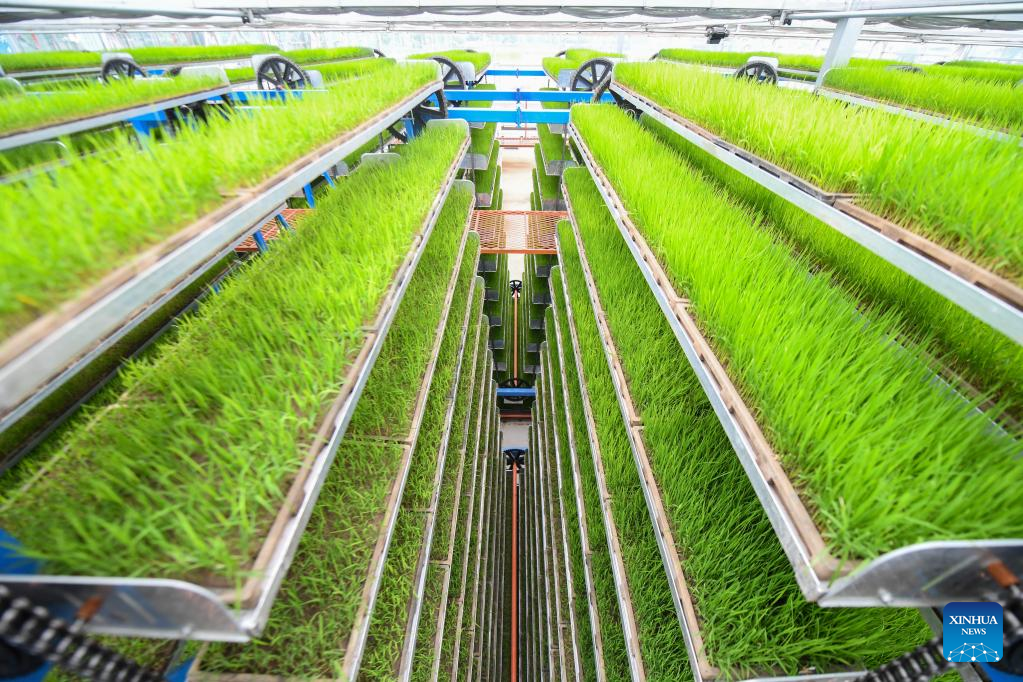 Rice seedling trays are transported on the conveyer belt at an intelligent rice farming demonstration base in Gongyi Town of Pengshan District in Meishan, southwest China's Sichuan Province, April 20, 2023. Pengshan District has taken efforts to speed up the construction of digital intelligent rice farming demonstration base. Intelligent machinery has been used in the process of raising and transplanting to improve the efficiency of rice farming. (Xinhua/Wang Xi)