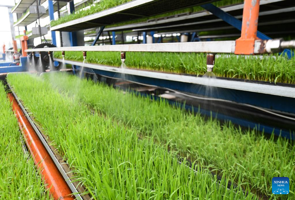 This photo taken on April 20, 2023 shows an intelligent rice seedling raising system of an intelligent rice farming demonstration base in Gongyi Town of Pengshan District in Meishan, southwest China's Sichuan Province. Pengshan District has taken efforts to speed up the construction of digital intelligent rice farming demonstration base. Intelligent machinery has been used in the process of raising and transplanting to improve the efficiency of rice farming. (Xinhua/Wang Xi)