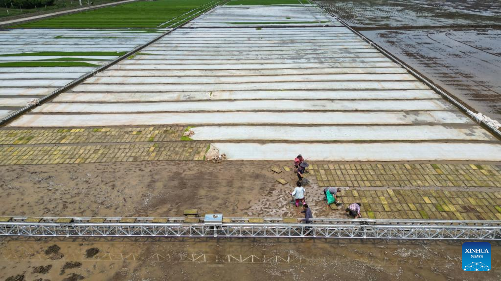 This aerial photo taken on April 20, 2023 shows farmers with an intelligent rice farming demonstration base raising rice seedlings in the fields in Gongyi Town of Pengshan District in Meishan, southwest China's Sichuan Province. Pengshan District has taken efforts to speed up the construction of digital intelligent rice farming demonstration base. Intelligent machinery has been used in the process of raising and transplanting to improve the efficiency of rice farming. (Xinhua/Wang Xi)
