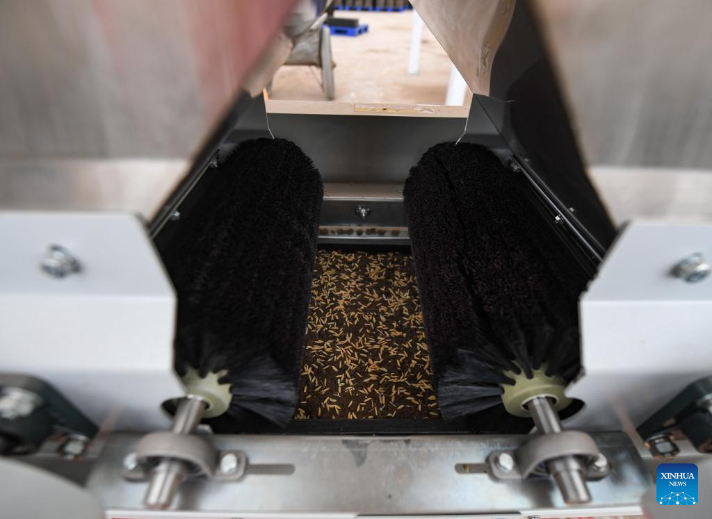 Rice seeds are sowed into rice seedling trays on an assembly line at an intelligent rice farming demonstration base in Gongyi Town of Pengshan District in Meishan, southwest China's Sichuan Province, April 20, 2023. Pengshan District has taken efforts to speed up the construction of digital intelligent rice farming demonstration base. Intelligent machinery has been used in the process of raising and transplanting to improve the efficiency of rice farming. (Xinhua/Wang Xi)