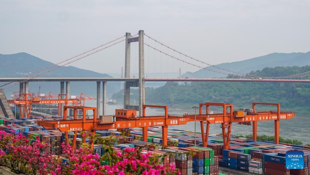 This photo taken on April 20, 2023 shows a view of Guoyuan Port in southwest China's Chongqing. Guoyuan port, the largest port on the upper reaches of the Yangtze River, has developed into an important multi-mode transport hub. Statistics reveal that the cargo throughput of Guoyuan Port reached 6.19 million tonnes in the first quarter of 2023, up 9.9 percent year on year. (Xinhua/Li Qianlei)