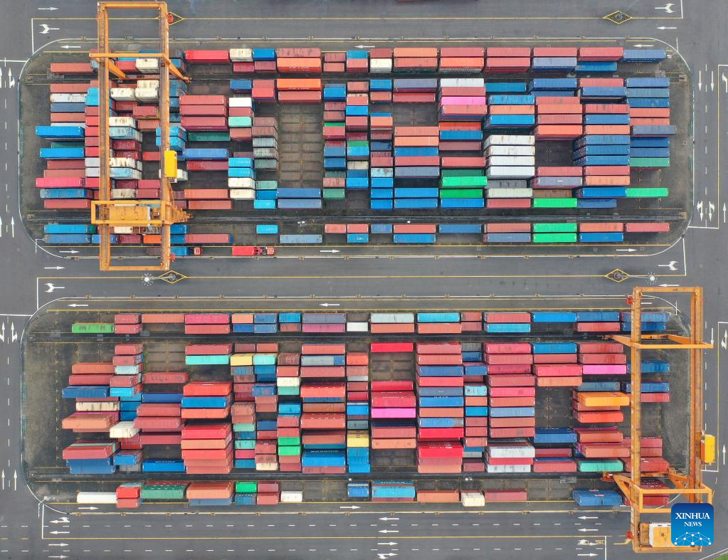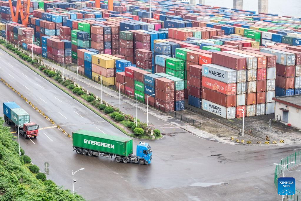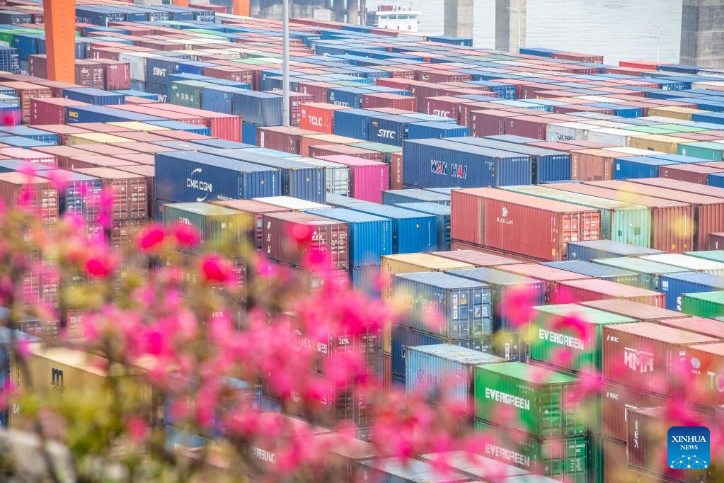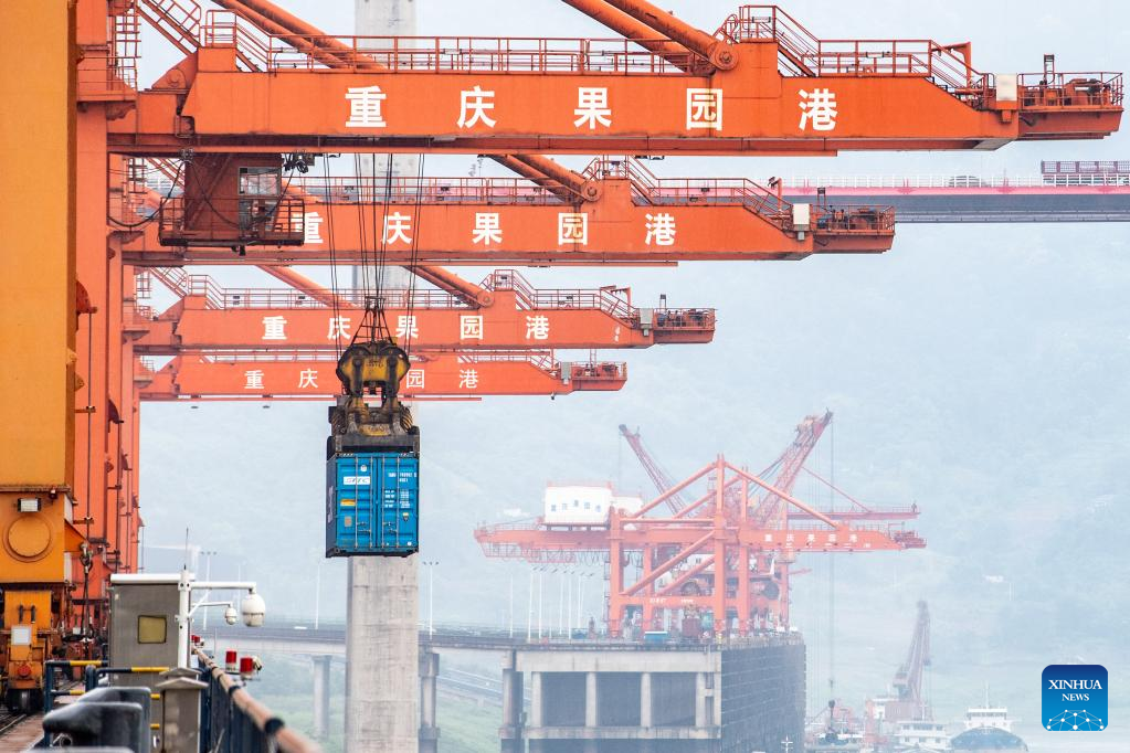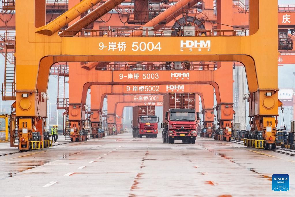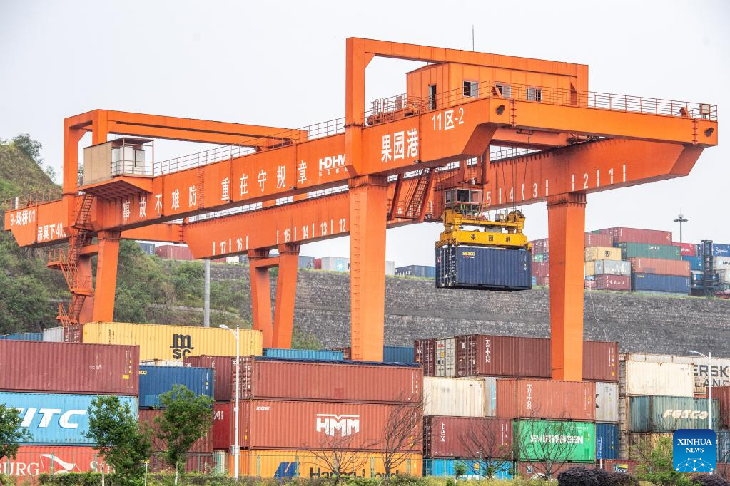 Containers are transported by trucks at Guoyuan Port in southwest China's Chongqing, April 20, 2023. Guoyuan port, the largest port on the upper reaches of the Yangtze River, has developed into an important multi-mode transport hub. Statistics reveal that the cargo throughput of Guoyuan Port reached 6.19 million tonnes in the first quarter of 2023, up 9.9 percent year on year. (Xinhua/Tang Yi)