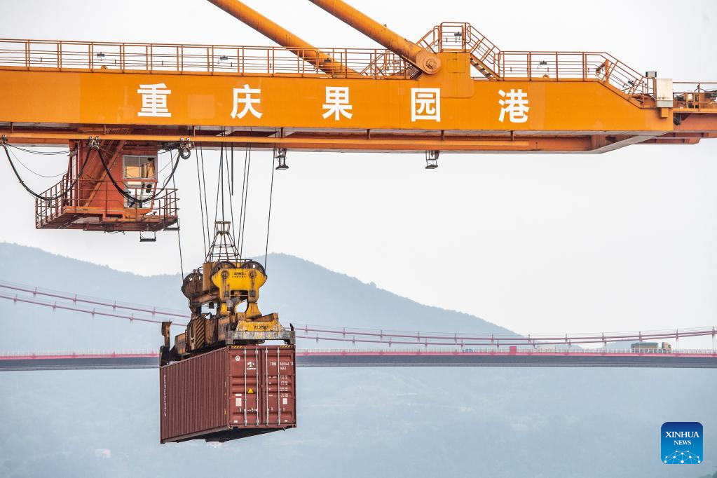 A crane lifts a shipping container at Guoyuan Port in southwest China's Chongqing, April 20, 2023. Guoyuan port, the largest port on the upper reaches of the Yangtze River, has developed into an important multi-mode transport hub. Statistics reveal that the cargo throughput of Guoyuan Port reached 6.19 million tonnes in the first quarter of 2023, up 9.9 percent year on year. (Xinhua/Tang Yi)