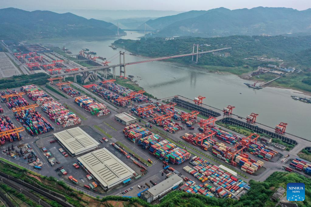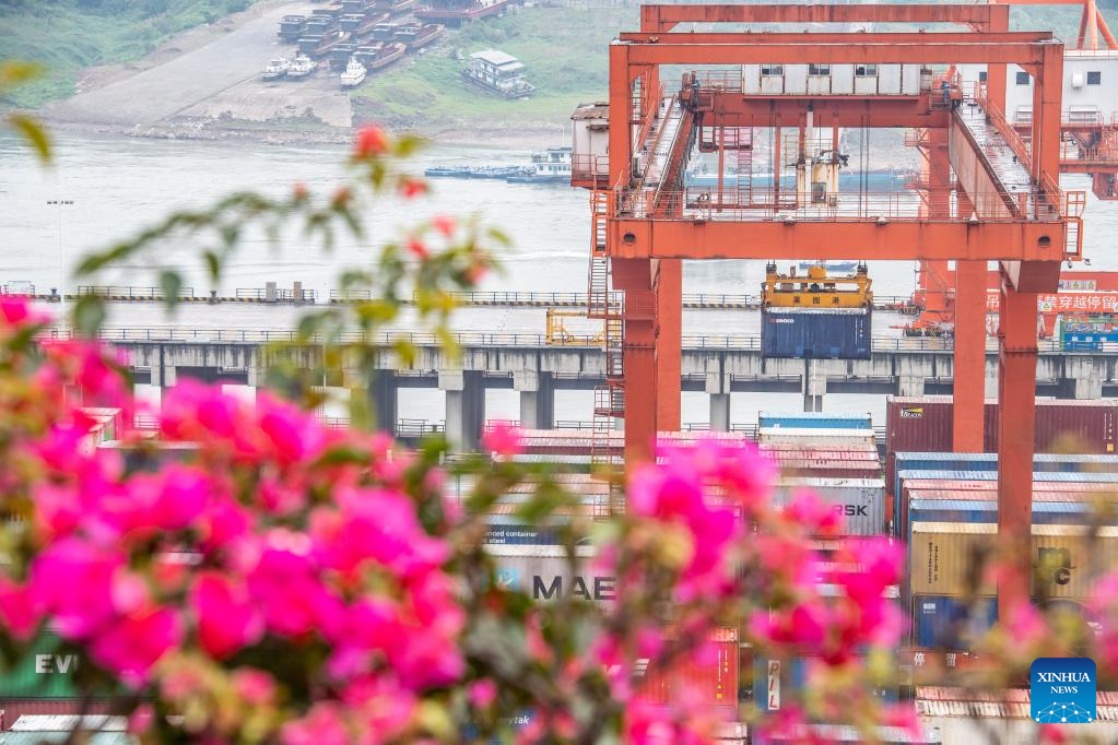 This photo taken on April 20, 2023 shows a view of Guoyuan Port in southwest China's Chongqing. Guoyuan port, the largest port on the upper reaches of the Yangtze River, has developed into an important multi-mode transport hub. Statistics reveal that the cargo throughput of Guoyuan Port reached 6.19 million tonnes in the first quarter of 2023, up 9.9 percent year on year. (Xinhua/Tang Yi)