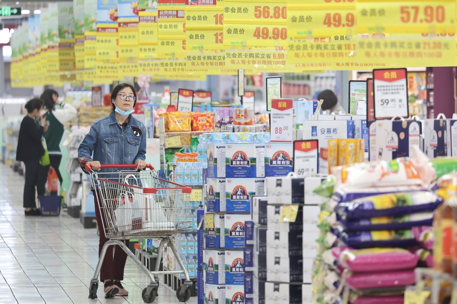 People shop at a supermarket in Nanjing, east China's Jiangsu Province, April 11, 2023. (Photo by Su Yang/Xinhua)