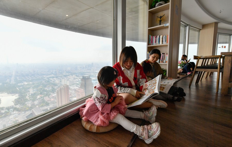 People read books at a bookstore in the Tianjin Television Tower in Hexi District of Tianjin, north China, April 22, 2023. (Xinhua/Sun Fanyue)