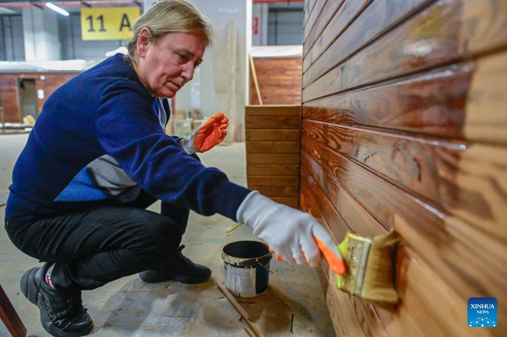 A volunteer applies varnish to a portable house designed to aid earthquake victims in Istanbul, Türkiye, April 13, 2023. The house is small but fully functional. A bathroom, a kitchen, and sleeping space are squeezed into 15 square meters to make the entire unit easy to transport, according to the builders. (Photo by Omer Kuscu/Xinhua)