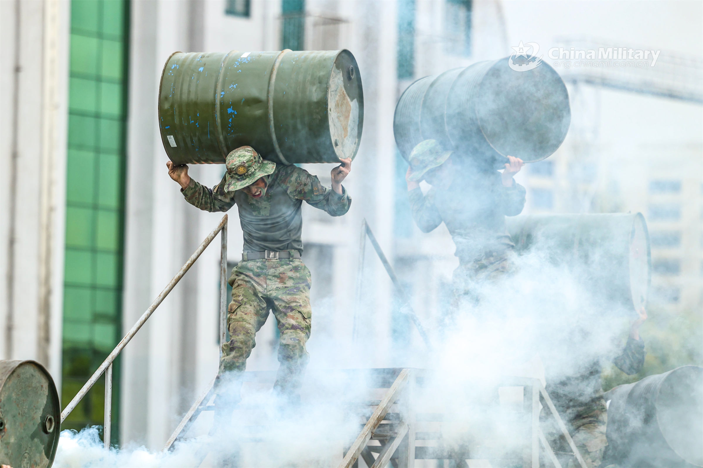 Special operations soldiers assigned to a brigade under the PLA 72nd Group Army run through the barrier with heavy metal buckets during an extreme fitness training exercise on March 29, 2023. (eng.chinamil.com.cn/Photo by Hu Xuefeng)