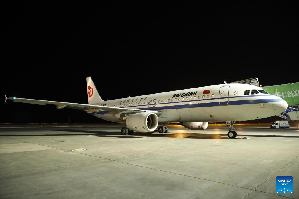 The first flight on the Beijing-Xi'an-Astana route arrives Astana, Kazakhstan, on April 21, 2023. (Photo by Kalizhan Ospanov/Xinhua)