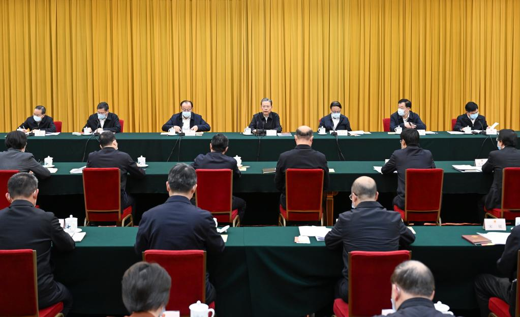 Zhao Leji, a member of the Standing Committee of the Political Bureau of the Communist Party of China Central Committee and chairman of the National People's Congress (NPC) Standing Committee, presides over the first plenary meeting of inspection teams for enforcement of the Seed Law in Beijing, capital of China, April 21, 2023. (Xinhua/Zhang Ling)