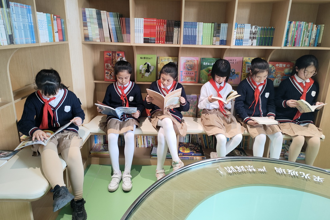 Children of a primary school read books at the library in Tianmen city, central China's Hubei Province, April 19, 2023. (People's Daily Online/Zhang Juan)